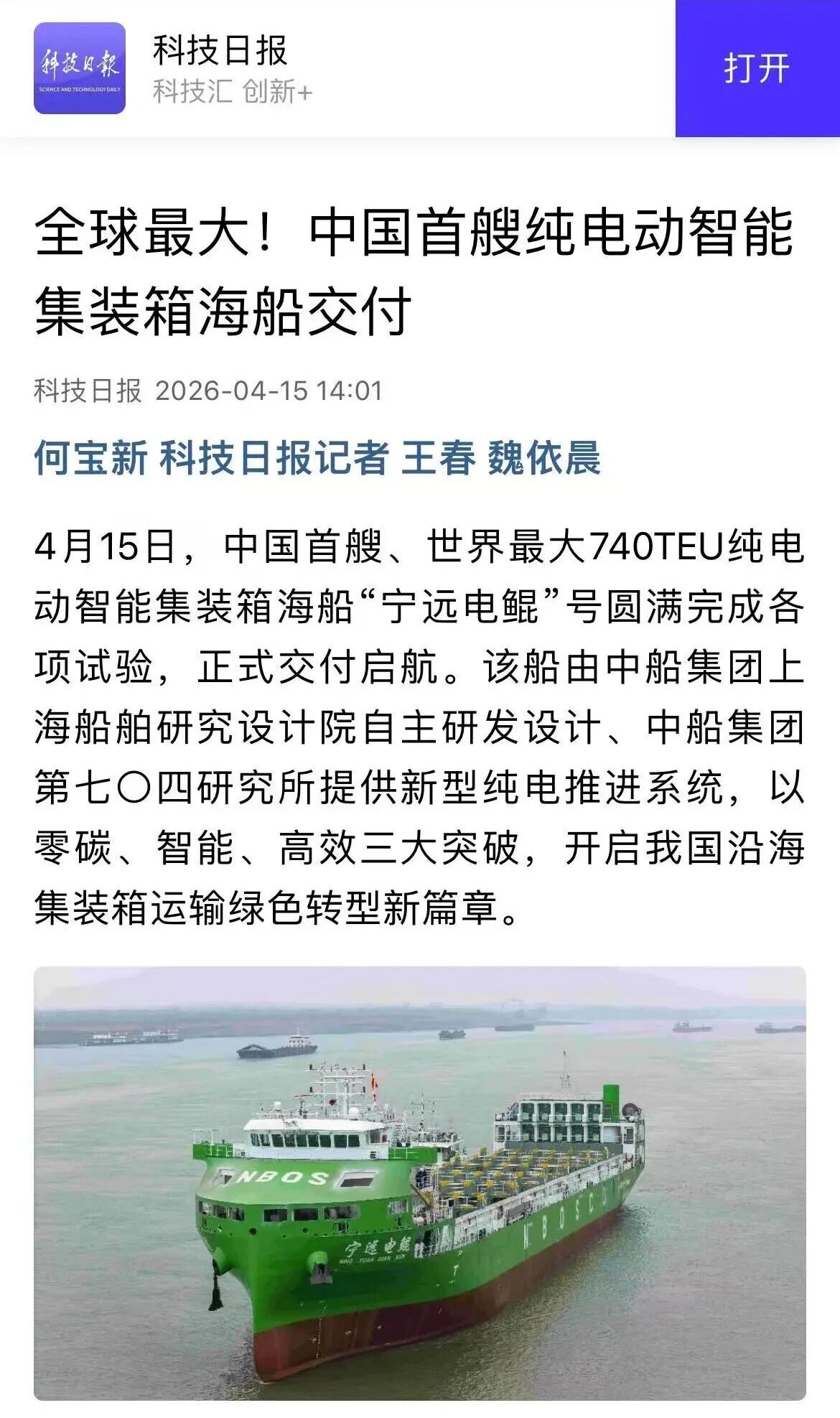 4月15日,由永利总站·(中国)集团 旗下六〇四院自主研发设计、七〇四所提供新型纯电推进系统的纯电动智能敞口集装箱海船“宁远电鲲”号正式交付启航。